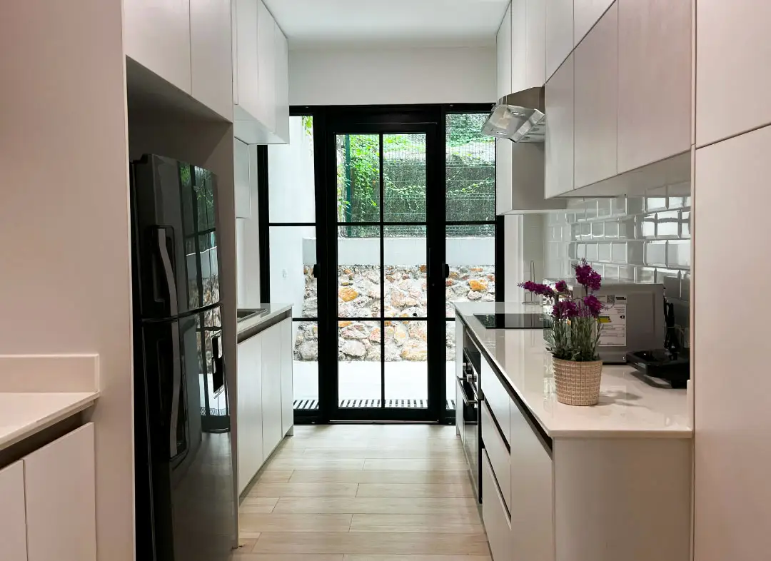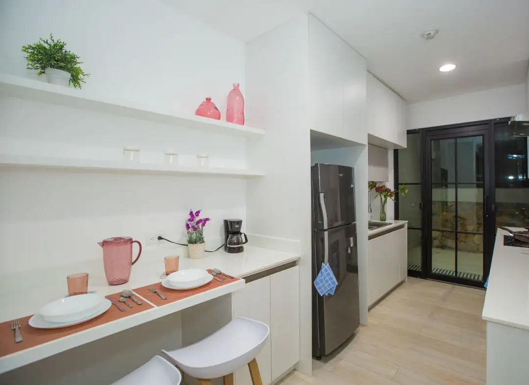 • Cocina moderna completamente equipada con horno, campana extractora y todos los utensilios necesarios. Incluye un pequeño comedor para 2 personas y acceso directo a una terraza privada para mayor comodidad.